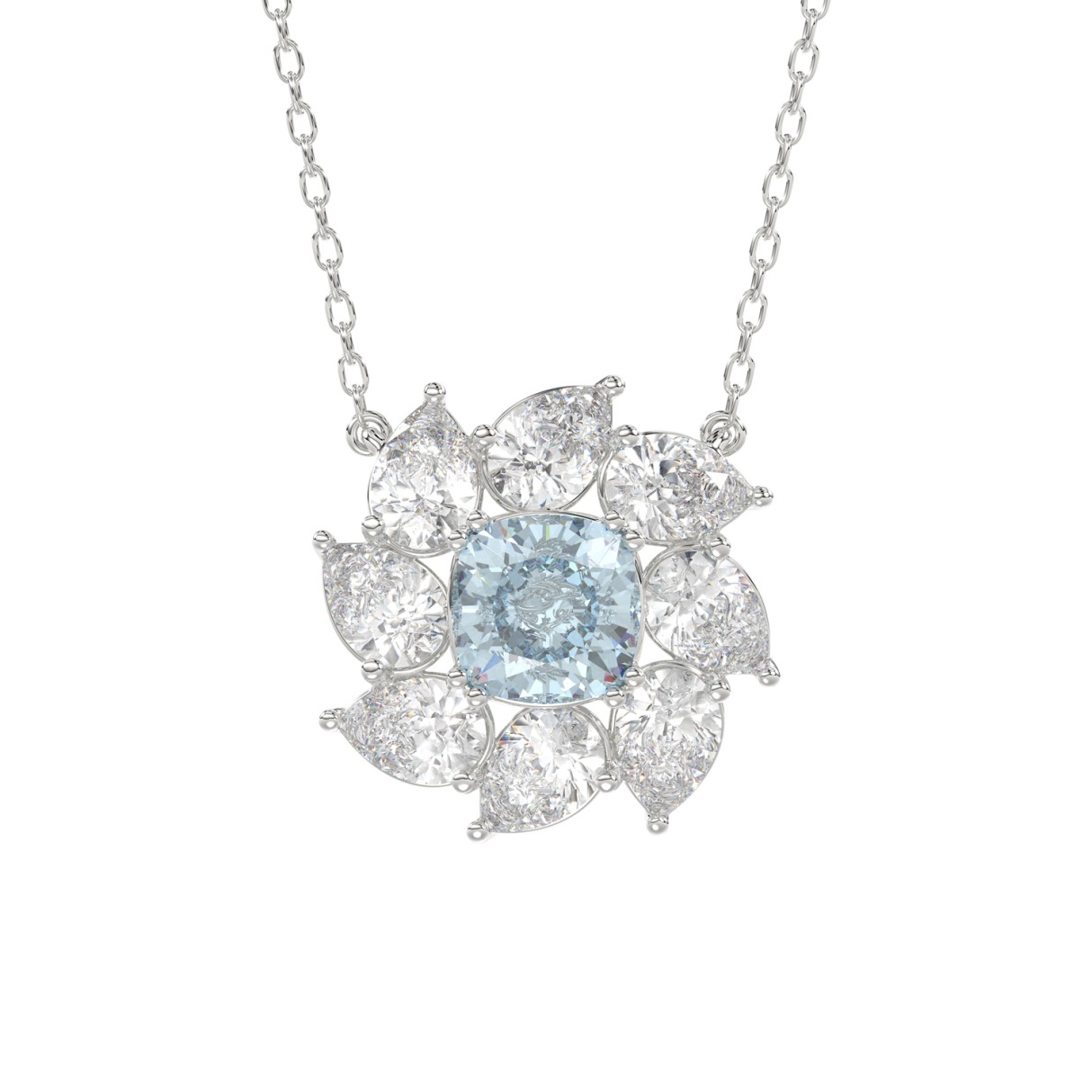 14K WHITE GOLD CRAFTED WITH 18K YELLOW GOLD BACK PLATE 2CT PEAR/BLUE CUSHION DIAMOND LADIES NECKLACE WITH CHAIN