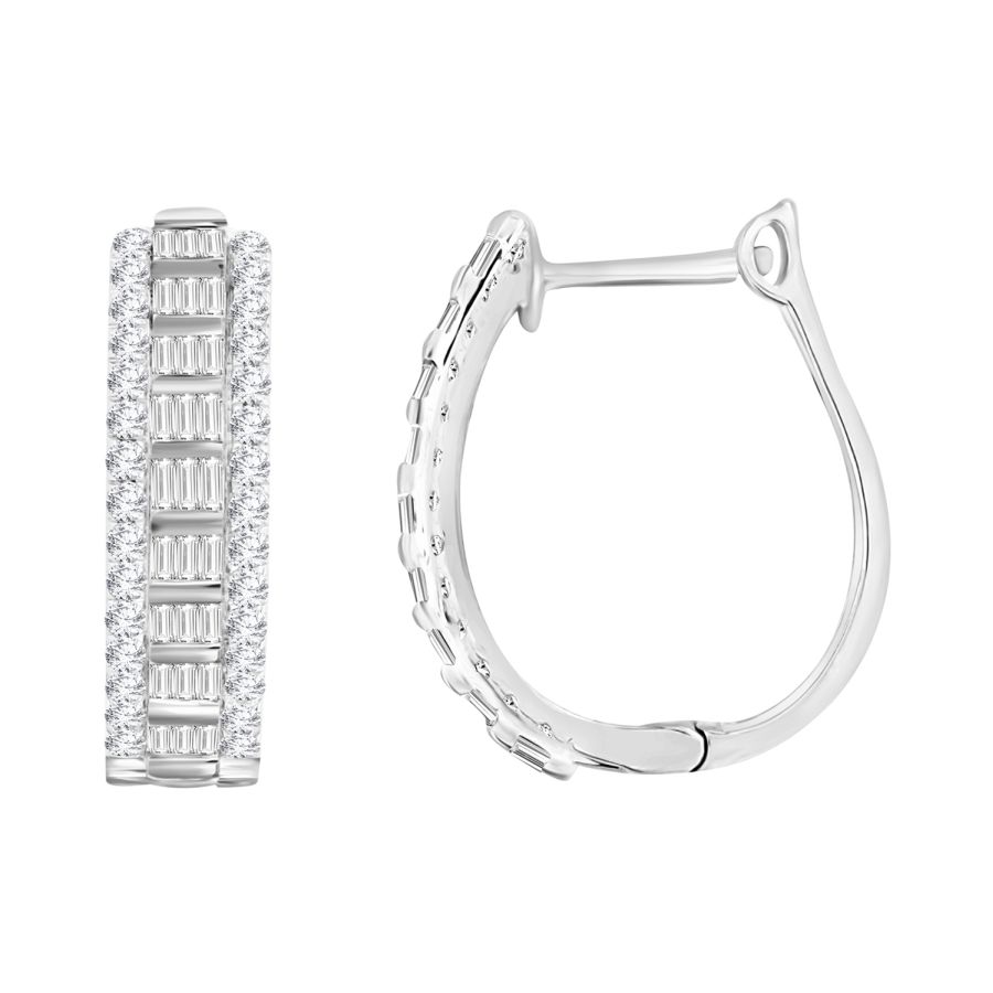 LADIES HOOP EARRINGS 0.50CT ROUND/BAGUETTE DIAMOND 10K WHITE GOLD